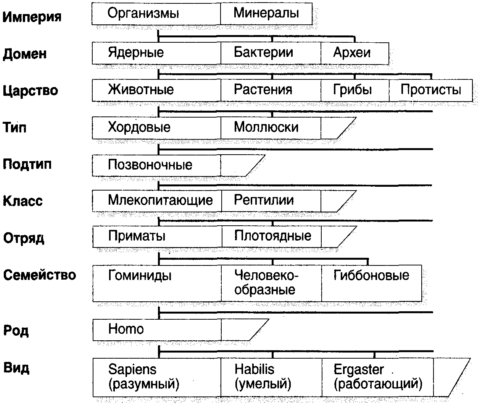 Рис. 1.1.Классификация Линнея первоначально состояла из восьми разрядов (домен, царство, тип, класс, отряд, семейство, род, вид), организованных в стиле римской армии. С тех пор древо классификации приобрело много промежуточных разрядов, некоторые из которых показаны здесь. Дерево на рисунке показывает, как человек вписывается в расширенную систему Линнея. Там, где отдельный таксономический уровень содержит лишь некоторые из таксонов, растущих из более высокого уровня, ряд оканчивается срезанным прямоугольником. Схема классификации остается спорной почти для каждого уровня: некоторые, например, предпочитают говорить о пяти царствах (включая в эту схему бактерии).