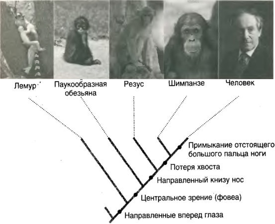 различные ветви, или клады, дерева жизни (рис. 1.2). Кладйстика была введена немецким таксономистом Вилли Хеннигом (1913-1976) и доработана в его Филогенетической систематике(1966). Согласно Хеннигу, классификация должна отражать генеалогическое родство, и организмы должны группироваться строго на основе их происхождения от общего предка. Не в пример легкомысленным теоретическим физикам, приспособившим к своим схемам повседневные слова, такие как «спин» (в переводе с английского «вращение») и «аромат», Хенниг перегрузил таксономию греческими терминами, и кладисты имеют дело с симплециоморфами (характеристиками, разделяемыми более чем одной тварью), синапоморфами (разделяемыми производными характеристиками) и т.д. К счастью, у нас нет необходимости использовать этот перегруженный язык, поскольку мы главным образом будем пользоваться системой Линнея. Однако кладистика весьма влиятельна, логична и полезна, так как она основана на генеалогии организмов, которая, как можно доказать, есть единственный рациональный фундамент классификации.Рис. 1.2.В кладистической классификации дерево, кладограмма, ветвится на каждой существенно особой характеристике. Формально мы говорим, что классификация основана на синапоморфах, которыми обладают производные гомологии; гомология —это признак, наследуемый от общего предка. Эта кладограмма показывает, как человек включается в данную схему.
