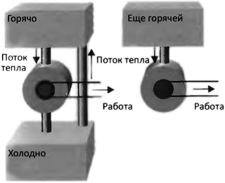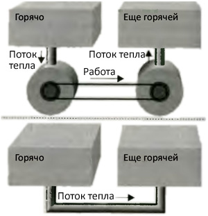 Рис. 4.5.Это устройство (сверху) показывает, что если формулировка Второго Начала, данная Кельвином, неверна, то формулировка Клаузиуса неверна тоже. Двигатель слева приспособлен для того, чтобы приводить в движение двигатель справа, работающий в обратном направлении, и превращать таким образом работу в тепло, которое будет запасена в «более горячем» резервуаре. Конечным результатом (внизу) будет перенос тепла от горячего к более горячему резервуару, что противоречит формулировке Клаузиуса.