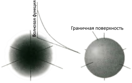 Рис. 5.5.Здесь изображены некоторые представления s– орбитали самого низкого энергетического уровня для атома водорода. Диаграмма слева показывает вероятность обнаружения электрона в каждой точке в виде плотности тени. Сопровождающий ее график показывает, как вероятность экспоненциально убывает с увеличением расстояние до ядра. Диаграмма справа показывает «граничную поверхность», представляющую собой поверхность, охватывающую 90 процентов вероятности обнаружения электрона.