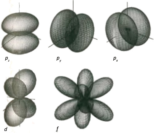 Существуют также решения, не обладающие сферической симметрией, в которых облака электронной вероятности сконцентрированы в областях, находящихся в разных местах по отношению к ядру, а не распределены однородно вокруг него. Нам необходимо знать о трех типах орбиталей, показанных на рис. 5.6. Орбитали, в которых вероятность собрана в две области, называются p– орбиталями, орбитали с четырьмя областями называются d– орбиталями, а орбитали с шестью областями называются f– орбиталями. Благодаря тому, что плотность тени, изображающая вероятность нахождения электрона в данном месте, меняется, когда мы, по пути измеряя ее, движемся по кругу вокруг ядра, p– , d– и f– орбитали соответствуют состоянию с ненулевым моментом импульса электрона, который они описывают, причем d– орбитали соответствуют более высокому моменту импульса, чем p-орбитали, а еще более искривленные f– орбитали соответствуют еще более высокому моменту импульса. Момент импульса является источником центробежной силы, которая отбрасывает электрон от ядра. Есть еще один незначительный технический момент, который скоро приобретет огромное значение: в результате такого центробежного эффекта в любой из этих орбиталей никогда нельзя обнаружить электрон возле самого ядра.