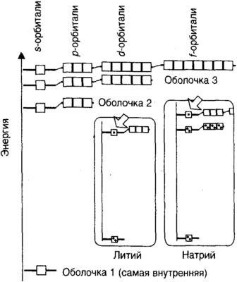 Рис. 5.7.Энергетические уровни типичных атомов. Для водорода, имеющего один электрон, все орбитали данного уровня имеют в точности одну и ту же энергию. Для отличных от водорода атомов (как изображено здесь) каждый уровень содержит орбитали с последовательно возрастающей энергией. Во всех случаях p– орбитали впервые появляются во второй оболочке, d– орбитали появляются в третьей оболочке, а f– орбитали в четвертой оболочке. Существуют оболочки более высоких энергий, чем показанные здесь. Каждый ящик представляет орбиталь, которую могут занимать не более двух электронов. Две вставки показывают аналогичные электронные структуры лития (с одним электроном вне сердцевины) и натрия (с одним электроном вне сердцевины).