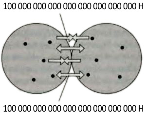 Рис. 6.9.Здесь показан необычайно тонкий баланс между двумя электрически нейтральными телами, состоящими из электронов (серый фон) и ядер (черные точки). Сила отталкивания между электронами в двух таких шарах с водой (представляющих человеческие тела в тесных объятиях) составляет триллионы и триллионы ньютонов (Н, единица силы; один ньютон приблизительно равен силе тяготения, действующей на стограммовое яблоко на дереве). Отталкивающая сила между ядрами имеет такое же значение. Однако притяжение между электронами одного тела и атомами другого также составляет триллионы и триллионы ньютонов, и по счастливой случайности отталкивание и притяжение в точности компенсируют друг друга. Это означает, что между нами в результате нет ни притяжения, ни отталкивания.