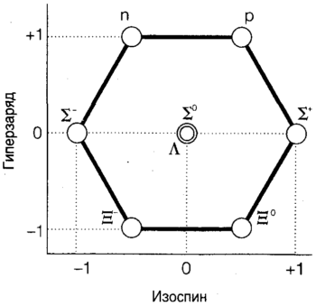 Рис. 6.10.Восьмеричный путь — это способ классификации и соотнесения элементарных частиц, довольно похожий на периодическую таблицу химических элементов. Здесь мы видим график для восьми частиц (только протон pи нейтрон n, видимо, нам знакомы, но они являются экзотическими единоутробными братьями), где по одной оси отложен изоспин (обсуждавшийся в тексте), а по другой оси — еще один вид внутренней симметрии, называемый гиперзарядом. Этим «путем» восемь частиц оказываются связанными. Более изощренные схемы улавливают и другие частицы.
