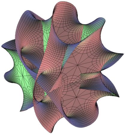 С точки зрения платоников (см. главу 10), математика уже где-то существует, ожидая, когда ее откроют, так что Калаби и Яу, возможно, скорее выкапывали предсуществующее, чем просто нечто создавали, как им, вероятно, казалось. Рисунок 6.17 демонстрирует одно из таких пространств. Формы, подобные этим — но в семи измерениях, — являются шлангами теории струн, поскольку струны вьются вокруг них