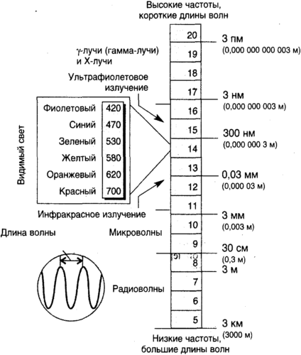 Рис. 7.1.Электромагнитный спектр и классификация разных его областей. Видимая часть спектра занимает очень узкую область длин волн, и длины волн (расстояния между соседними гребнями в волне, как показано на вставке) соответствующих цветов, воспринимаемых нами, даны в нанометрах (миллиардных долях метра) в прямоугольнике «Видимый свет». Числа в высоком вертикальном прямоугольнике представляют собой степени, в которые надо возвести десять, чтобы получить частоту в циклах в секунду (герцах, Гц), например, 8 указывает частоту 10 8Гц (сто миллионов циклов в секунду). Классификация областей не является жесткой, и у спектра нет ни верхней, ни нижней границы.