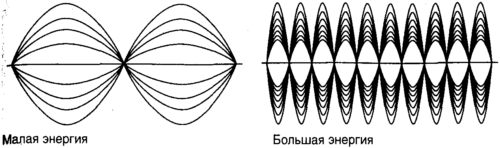 Квантовая механика делает ряд предсказаний, которые шокирующе отличаются от предсказаний классической механики, и пришло время рассмотреть эти различия. Давайте предположим, что горизонтальная проволока является короткой и что движение шарика ограничено всего несколькими сантиметрами посредством зажимов на каждом конце, как на счетах. Решающей чертой здесь является то, что допустимы только те волновые функции, которые согласуются с краевыми точками, так же как струна скрипки, зажатая в определенном месте, может совершать лишь колебания, допускаемые ее концами. Поскольку кривизна волновой функции определяется кинетической энергией шарика, а значит, его полной энергией (так как потенциальная энергия постоянна), мы заключаем, что в таком устройстве шарик может обладать только определенными энергиями. Другими словами, энергия шарика квантована, в том смысле, что она принимает дискретные значения, а не меняется непрерывно (рис. 7.10). Это общее заключение: квантование энергии, первоначально предполагаемое Планком и Эйнштейном, является следствием уравнения Шредингера и требования, чтобы волновая функция была должным образом согласована с пространством, по которому странствует частица. Вот так квантование энергии автоматически вытекает из уравнения Шредингера и так называемых «граничных условий» системы.