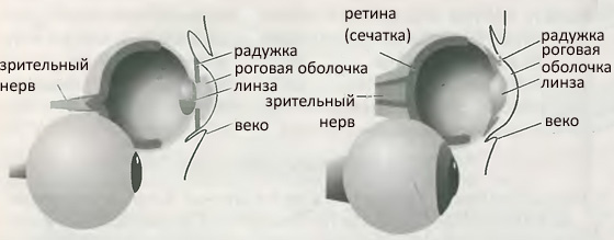 Рис. 1.5.Диаграмма слева показывает общую схему глаза млекопитающего. Заметим, что кровеносные сосуды находятся спереди от светочувствительной ретины и вынуждены искать путь для выхода через ретину, создавая таким образом слепое пятно. Диаграмма справа показывает устройство более, по-видимому, чувствительного устройства головоногих, с кровоснабжением на задней стороне ретины. Хотя эволюция наталкивается на каждое устройство вслепую, она не смогла повернуть назад, поскольку ценность чувствительности к свету, развившейся в зрение, была уж очень велика. Случайно оказалось, что существует по крайней мере одно преимущество в устройстве глаз млекопитающих: течение крови в этом устройстве помогает снизить число случаев их заболеваний.