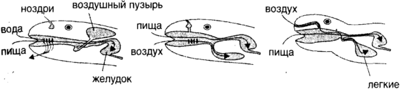Рис. 1.6.Другим примером досадного отсутствия предвидения является слепая эволюция дыхательной и пищеварительной систем у млекопитающих. Диаграмма слева показывает их схему для типичной рыбы. Ноздри (формально: носовые ходы)ведут в закрытую полость и служат главным образом для обоняния. Кислород извлекается из воды во время ее прохождения через рот и выталкивается через жабры. Воздушный пузырь используется для контроля над глубиной, подобно резервуарам для балласта в подводных лодках. Средняя диаграмма показывает это устройство у рогозуба, предка современных млекопитающих. Из ноздрей открыт проход в полость рта, но они пока используются только для обоняния. Воздух заглатывается ртом и входит в воздушный пузырь. Остается лишь краткий эволюционный шаг к подобному, показанному справа, устройству у млекопитающих, в котором ноздри уже используются для поступления воздуха. К несчастью, воздух и пища попадают в одну и ту же камеру, прежде чем первый проследует далее к легким через трахею, а вторая к желудку через пищевод. Топорно сработанное, скудное и скупое, но эволюционно понятное приспособление чревато опасностью заклинивания.