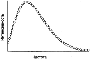 Рис. 8.3.Интенсивность излучения, заполняющего пустое пространство, может быть измерена для каждой длины волны, и кружочки показывают полученные таким способом величины. Сплошная линия является интенсивностью, предсказываемой законом Планка для излучения черного тела (глава 7), если температура тела равна 2,728 К.