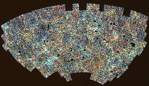 Рис. 8.5.Распределение галактик, наблюдаемое с Земли. Каждая точка представляет положение одной галактики. Заметим, что распределение неоднородно: существуют длинные волокна галактик и огромные области с числом галактик ниже среднего. Эти неоднородности являются колоссально увеличенными остатками флуктуаций плотности первичной Вселенной.