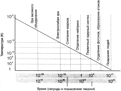 Этот огромный узор является увеличением ряби, сопровождавшей начало Вселенной, когда вариации плотности имели масштаб в нескольких планковских длин, но были растянуты до современных гигантских размеров. Вселенной хватило 15 миллиардов лет, чтобы достичь такой стадии, но этот период, относительно короткий в нелепых человеческих единицах (ибо какое имеет значение, сколько раз наша маленькая планета обернулась вокруг нашей маленькой звезды), имеет огромную временную протяженность на фундаментальных планковских часах, занявшую не меньше чем 10 61тиканий (рис. 8.6).