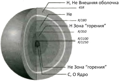 Рис. 8.7Внутренняя структура типичной звезды с массой около пяти солнц на подходе к фазе красного гиганта с углеродно-кислородным ядром. Для наглядности радиусы внутренних оболочек увеличены относительно поверхности (белая полоска характеризует изменение масштаба).