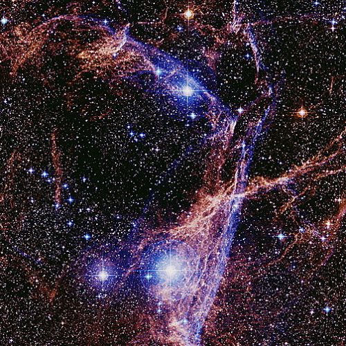 Рис. 8.8.Остатки сверхновой типа II (остатки в Веле). Эта сверхновая появилась 11 тысяч лет назад, и мы можем наблюдать, как именно вещество — элементы, находившиеся внутри звезды — рассеивается по Вселенной. Вела (Паруса) это яркое созвездие в северной части Млечного Пути; когда-то оно считалось частью созвездия Аргонавтов, кораблем Ясона. Разные типы сверхновых различать очень трудно.