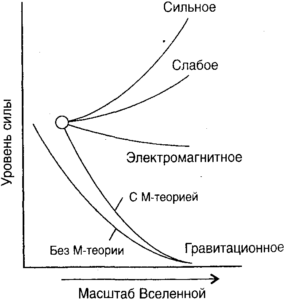 Оставшейся проблемой является причина трехмерности нашего пространства. Первый намек на возможное объяснение начинает возникать из теории струн. Мы подозрительно упорно умалчивали в этой главе о теории струн, если не считать слабого проблеска ее присутствия в сносках, главным образом потому, что она все еще так спекулятивна. Однако существуют некоторые указания на то, что теория струн приложима к очень ранним стадиям появления Вселенной — как оно и должно быть, если это фундаментальная теория вещества — и что в самый ранний момент Вселенной произошел не взрыв частиц, а взрыв струн: взрыв спагетти, а не манной крупы. Например, мы видели, что в очень ранние времена, а значит, при очень высокой температуре, перед тем как произошло нарушение симметрии, все силы имели одинаковый уровень. Но это не вполне верно, поскольку оказывается, что если вычисления проделаны тщательно, то уровни гравитационного, сильного и электрослабого взаимодействий в очень ранней Вселенной, в первое тиканье планковских часов, не вполне совпадают (рис. 8.11). Однако, когда в игру вступает теория струн, это малое расхождение удаляется, и силы в момент их рождения оказываются в точности равными.