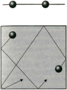 Рис. 8.12.Две частицы в одномерной области — как две бусины на нитке (верхняя иллюстрация) — обязательно встретятся, если только они не движутся с одинаковой скоростью. В двумерной области — как у бильярдных шаров на бильярдном столе (нижняя диаграмма) — шансы их встречи сильно уменьшаются.