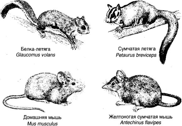 Рис. 1.8.Хотя Австралия и Южная Америка были изолированы, эволюции пришлось столкнуться там со сходными проблемами и прийти к сходным решениям. Здесь приведены два примера млекопитающих и их сумчатые эквиваленты.