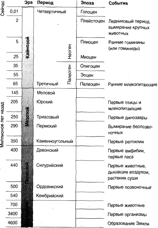Рис. 1.9.Геологические возрасты Земли, с именами, данными эрам, периодам и эпохам, на которые разделен каждый из них. Некоторые из главных событий приведены в правой