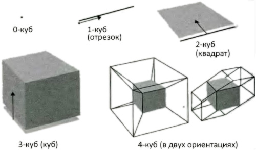 Рис. 9.2.Кубы различных размерностей могут быть построены с помощью движения куба предшествующей размерности в новом, перпендикулярном направлении. Здесь мы видим семейство кубов, построенных из 0-куба (точки). Отрезок (1-куб) получен протаскиванием точки в одном направлении, квадрат (2-куб) — протаскиванием отрезка в перпендикулярном направлении, обычный куб (3-куб) — протаскиванием квадрата в новом перпендикулярном направлении. Мы научились интерпретировать результаты двумерных представлений куба. Наконец, четырехмерный гиперкуб (4-куб) строится путем протаскивания 3-куба в еще одном перпендикулярном направлении. Мы, человеческие существа, еще не знаем, как интерпретировать результирующую диаграмму: я показываю два изображения, полученных вращением гиперкуба в разных направлениях.