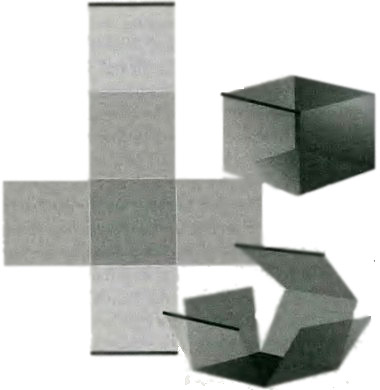 Рис. 9.3.Обычный куб в трехмерном пространстве может быть построен из крестообразной формы, состоящей из шести квадратов, путем склеивания вместе соседних сторон, перегибания длинной полосы и соединения краев, помеченных жирной чертой. То, что для соединения краев с жирной чертой можно использовать измерение, перпендикулярное к странице, легко увидеть нам, а существам, живущим в двумерном мире, трудно.
