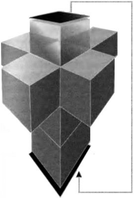 Рис. 9.4.Теперь мы делаем шаг в следующую размерность и строим гиперкуб из этого набора, содержащего восемь трехмерных кубов (один спрятан прямо под верхним кубом), путем склеивания вместе соседних граней. Нам также нужно склеить две грани, помеченные темными плоскостями и точечной линией. Тем, кто ограничен тремя измерениями, трудно увидеть, как можно выполнить эту операцию, но в четырех измерениях это сделать легко.