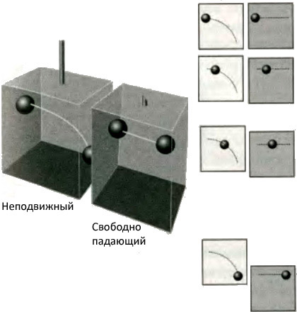 Рис. 9.11.В неподвижном лифте (слева) путь мяча, спроектированный на вертикальную плоскость, является параболой, загнутой книзу по направлению к полу. В свободном пространстве, далеко от гравитационных масс, путь мяча является прямолинейным (посередине). Последовательность изображений справа показывает, что происходит. В белых ящиках показан в преувеличенной манере путь мяча в неподвижном лифте. Серые ящики показывают, как лифт с ускорением меняет свое вертикальное положение, и это изменение положения в точности компенсирует изменение положения падающего мяча относительно лифта.