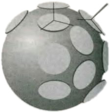 Эйнштейна были его размышления о том, как геометрия в нашей падающей кабине связана с геометрией в другой кабине, которая может падать с другим ускорением. Например, ваш небоскреб может быть построен на астероиде, и вы падаете, ускоряясь очень, очень медленно. Моя кабина может быть расположена на Земле, и ее ускорение будет около 10 м/с 2(так что через 1 с она падает со скоростью 10 м/с, через 2 с падает со скоростью 20 м/с и так далее). Геометрия пространства-времени является плоской — геометрией Минковского — в каждой из наших кабин, но мой маленький кусочек плоской геометрии изгибается и скручивается относительно вашего. Вы можете представить себе попытку покрыть шар монетами (рис. 9.12): каждая малая область является плоской, но одна область лежит под углом к другой области. Вопрос, который поставил и спустя годы напряженной работы ума разрешил Эйнштейн, заключался в том, как связаны друг с другом области плоского пространства-времени в близком присутствии скопления массы, такого как звезда. Если я могу описать мое земное пространство-время с точки зрения вашего астероида, то я на самом деле описываю воздействие, которое ученые обычно называют гравитацией.Рис. 9.12.Локальная геометрия в каждой точке пространства является евклидовой (представлена плоскими кружками, прикрепленными к разным точкам сферы). Однако около тяжелого тела, такого как звезда или планета, пространство искривляется, и локальные евклидовы области изгибаются и скручиваются относительно других локальных областей. Общая теория относительности Эйнштейна показывает, как связать различные локальные системы координат друг с другом.