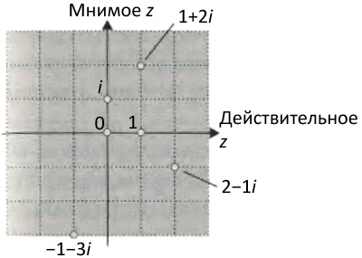 Рис. 10.5.Комплексное число является двухкомпонентным числом и как таковое может быть представлено точкой на плоскости. Например, комплексное число 2 – 1 iобозначается точкой с координатами 2 единицы по горизонтальной оси и 1 единица вниз по вертикальной оси. Операции с комплексными числами есть просто операции с двухкомпонентными объектами.