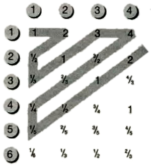 Чтобы убедиться в том, что это так, взгляните на рис. 10.6, где я нарисовал таблицу всех рациональных чисел (но показал только малую часть из них). Поверху вправо идут натуральные числа, указывающие числитель дроби, которую мы намереваемся построить, а слева вниз идут натуральные числа, указывающие ее знаменатель. Внутренняя часть таблицы содержит все возможные дроби, получаемые делением одного натурального числа на другое. Здесь будет много повторений, таких как 3/6 и 4/8 оба равны 1/2, но это не имеет значения. Теперь мы можем провести линию, которая пробегает от первой цифры таблицы через все остальные, как показано на рис. 10.6. Затем, продвигаясь вдоль этой линии, будем вести счет 1, 2, … каждой встречающейся дроби. Таким способом все дроби — все рациональные числа — оказываются поставленными во взаимно однозначное соответствие с натуральными числами. Мы никогда не выйдем за пределы натуральных чисел, поэтому количество рациональных чисел таково же, как и количество натуральных чисел, несмотря на то, что они расположены плотнее, чем натуральные числа. Существует бесконечное число рациональных чисел между 0 и 1 и между 1 и 2, но их бесконечное число между 1 и 2 такое же! Короче говоря, мы всегда можем пересчитать рациональные числа — мы говорим, что они счетны— и получить ответ «бесконечность» безотносительно к интервалу чисел, на котором производится счет. Возможно, вы начинаете понимать, что бесконечность является расплывающимся и ускользающим понятием.