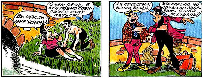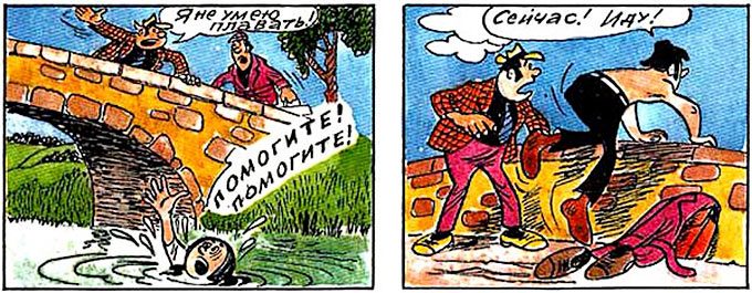 Но тут он услышал крики о помощи. На мосту метался зевака, не умеющий плавать.