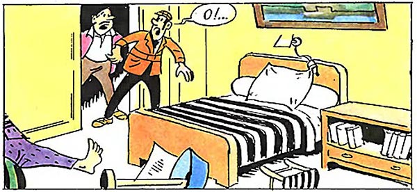 Утром, по пути на работу, Людовин навещает своего друга Гастона. Неудачно упав, Гастон сильно поранил нолено и теперь должен лежать в постели, избегая всяких движений. Но Гастон не понимает всей серьезности травмы.