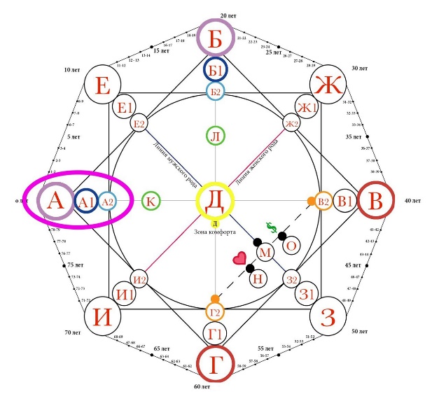 Точка А – это личная карма ребенка, урок, который должна пройти его душа по взаимодействию с членами рода и семьи. Карма первого поколения