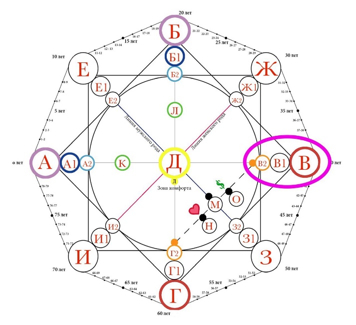 Точка В2 – это точка входа в линию финансов текущего воплощения. Она показывает, как научиться зарабатывать не только на закрытие базовых потребностей, но и для своего удовольствия. Урок Души для наработки опыта не только зарабатывать, но и тратить деньги на себя, семью.