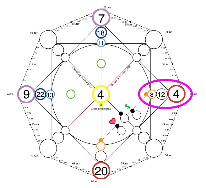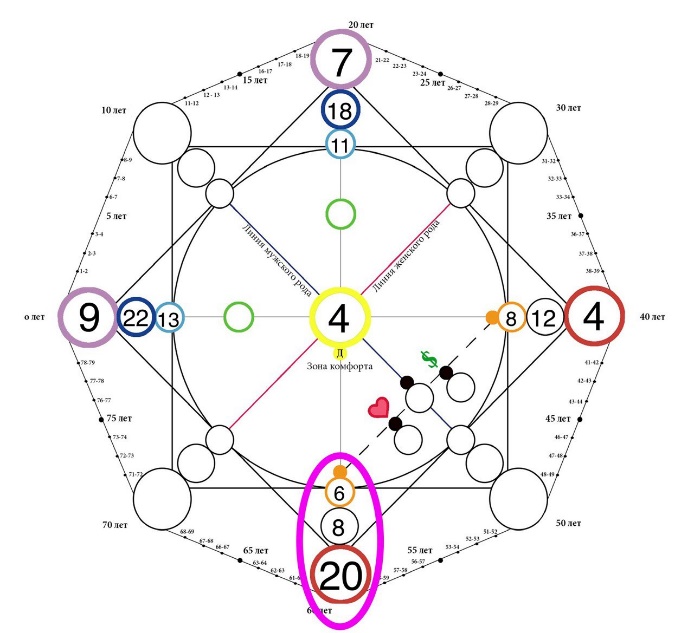 Эта зона покажет какие духовные ошибки были совершены Душой в прошлом воплощении, нераскрытые таланты, невыполненные предназначения. Это зона кармы, которая влияет на все сферы жизни текущего воплощения и поэтому стоит обращать особое внимание на эти позиции, если у ребенка не получается найти свое место в жизни, сложности в раскрытии талантов. В этих точках скрыты подсознательные блоки, страхи, установки, комплексы ребенка, которые могут мешать его реализации, раздражать как его самого, так и родителей. Это то, что ребенок может сам не осознавать или боится признаться себе и родителям, что его беспокоит. Духовные уроки Душа проходит через негативные жизненные сценарии и по этим позициям родители могут получить рекомендации по особенностям воспитания ребенка и как помочь пройти уроки Души. Эту зоны матрицы еще принято называть – кармический хвост.