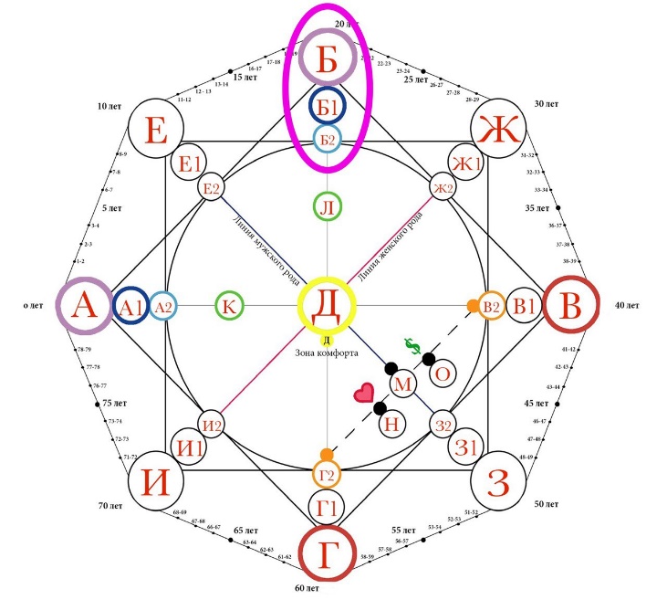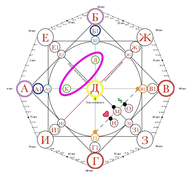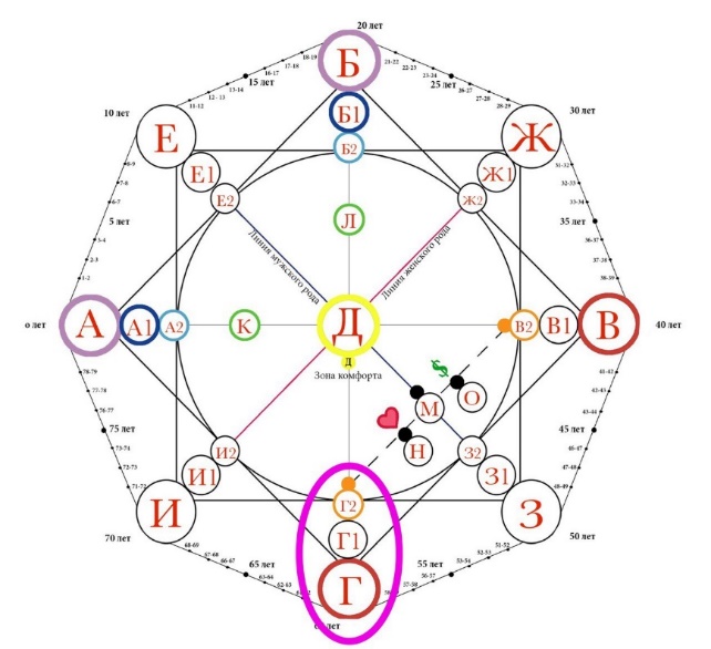 Точка Г2 – данная точка показывает какая основная ошибка была совершена в прошлом и как она влияет в текущем воплощении на построение отношений внутри родительской семьи, а в будущем и в своей собственной. Это про умение жить в удовольствие, получать наслаждение от жизни, гармоничное взаимодействие с людьми на разных уровнях партнерства.