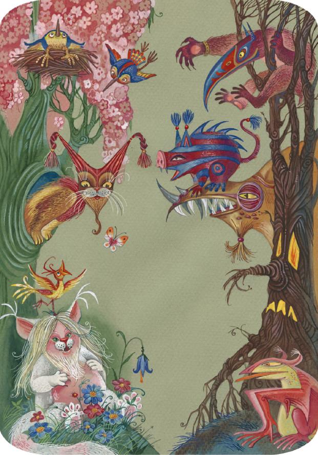 …он оглянулся кругом и видит, что со всех сторон, из-под каждого дерева и кустика, из-под воды, из-под земли лезет к нему сила нечистая и несметная, всё страшилища безобразные.