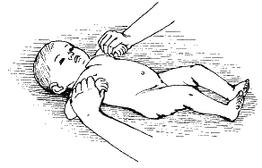 Выполните поглаживание несколькими пальцами в области ребер, направляя движения от середины груди к ее боковым поверхностям. Старательно избегайте надавливания на грудину.
