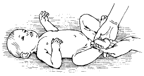 Исходное положение: ребенок лежит на спине ногами к вам. Выполните интенсивные, но осторожные поглаживания задней и наружной поверхностей голеней и бедер в направлении от стопы к бедру, старательно обходя область коленей.