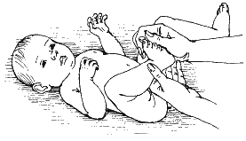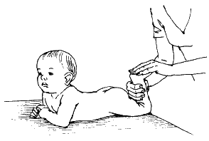 Исходное положение: ребенок лежит на животе, его ноги (стопы) свисают со стола. Средним и указательным пальцами обхватите ногу малыша, а большим осторожно нажмите на его стопу у основания пальцев. Это должно вызвать сгибание стопы. Затем с нажимом проведите по наружному краю стопы от пальцев к пятке: произойдет ее разгибание.