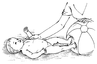 1. Рефлекторное упражнение на опору и выпрямление ног. Поддерживая ребенка вертикально, дайте ему упереться ногами в поверхность стола. При соприкосновении ног с опорой должно произойти рефлекторное разгибание согнутых ног.