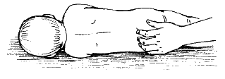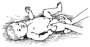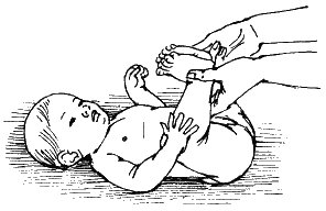 В положении лежа на животе выполните поглаживание, а затем растирание задних и наружных поверхностей ног, после чего, согнув ноги малыша так же, как при ползании, поочередно разведите их в стороны, одновременно фиксируя таз. После этого согните ноги одновременно, разведя колени ребенка в стороны. В положении лежа на спине выполните поглаживание и растирание передних и наружных поверхностей ног. Эти приемы нужно проводить вместе с расслаблением приводящих мышц бедер: сгибанием ног малыша в тазобедренных и коленных суставах с мягким их разведением.