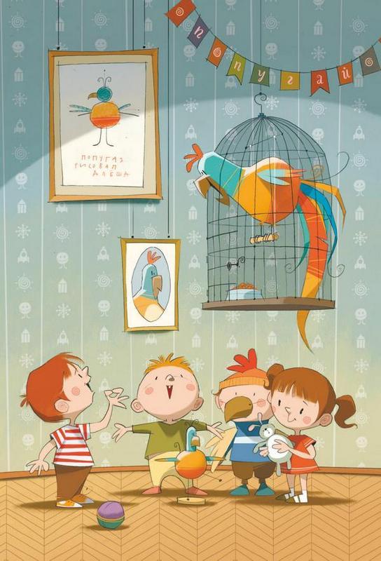 Детский сад, восьмая группа —Это смех и беготня.Детский сад, восьмая группа —Озорная ребятня.Там, в углу, в огромной клеткеПопугай большой сидит.Он в оранжевой «жилетке»,У него серьёзный вид.Он за всеми