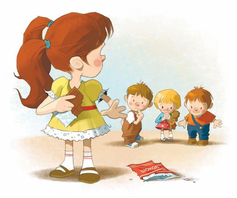 Есть у Лады шоколадка.Как сейчас ей будет сладко!Принесла с собой в детсад.Лада любит шоколад.Угощать детей не стала —Шоколада слишком мало! —Отвернулась от ребят,Развернула шоколад.Начала кусать украдкой…Почему же ей не сладко?!Шоколад вдруг горьким стал.Он испорчен? Он пропал?Поняла внезапно Лада:Всё в порядке с шоколадом.Ясно, что тому виной —Просто горько есть одной.«Налетай! – сказала Лада. —Угощаю шоколадом!»Уголок отгрыз Кирилл,Ян немного откусил.Протянула руку Мила,Эвелина отломила.По кусочку – Глаше, Свете…Окружили Ладу дети.Вот теперь со всеми ЛадаПоделилась шоколадом.Все едят, и каждый рад:Очень сладкий шоколад!