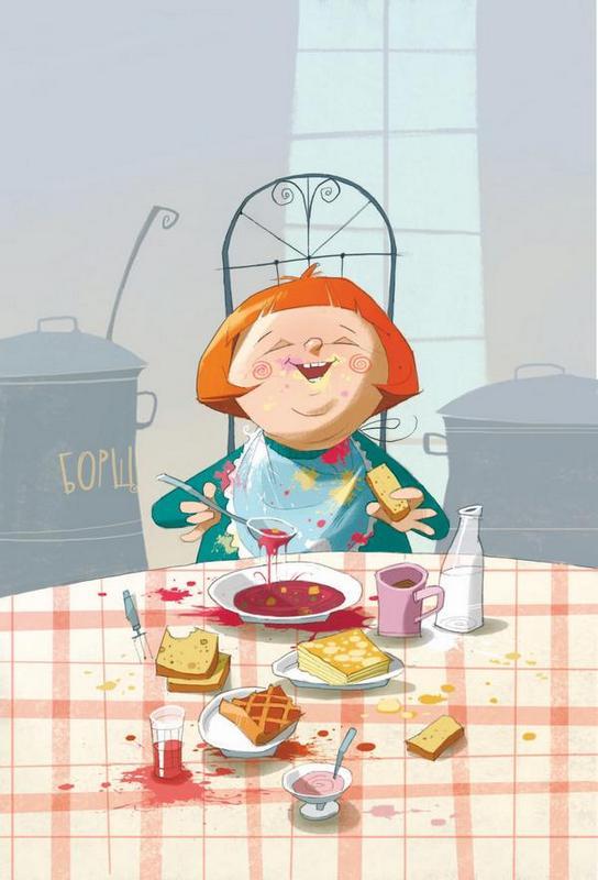 Утром ели кашу,Пили простоквашу.Борщ давали на обед,А на полдник был омлет.Ужин – запеканка:Творожок, сметанка,Пирога большой кусок,А ещё вишнёвый сок.Если вдруг забыл, что ел, —Ты на Катю посмотрел.Ведь у нашей КатиВсё меню на платье!