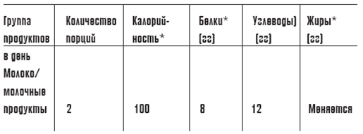 В нашем плане питания приведено конкретное количество калорий, получаемых с продуктами каждой группы. Таким образом, вы можете составить план питания для себя лично, исходя из ваших вкусов. Калорийность приведена в расчете на 1 порцию. Например, порция молочных продуктов в 100 ккал содержит около 8 г белка и 12 г углеводов. А жирность будет меняться в зависимости от того, какой продукт вы купите – обезжиренный, нежирный или обычный. Большинство продуктов содержат всю необходимую информацию на этикетке в разделе «Питательная ценность».