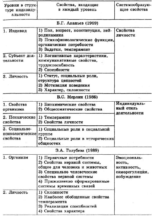 В отечественной психологии существует несколько подходов к выделению структуры индивидуальности, авторами которых являются Б.Г. Ананьев, B.C. Мерлин, Э.А. Голубева. Сопоставительный анализ их взглядов проведен М.С. Егоровой (5).