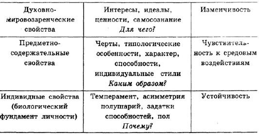 Тогда на нижнем уровне (биологическом фундаменте личности) мы можем собрать все индивидные, формально-динамические характеристики (пол, темперамент, задатки способностей, асимметрию полушарий головного мозга). На втором уровне мы размещаем предметно-содержательные качества (черты, типы личности, способности, стилевые характеристики поведения). А на третьем, верхнем уровне будут присутствовать духовно-мировоззренческие характеристики (направленность личности, ценности, убеждения, взгляды, установки).