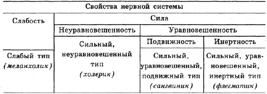 Одним из первых на связь поведения и свойств нервной системы обратил внимание выдающийся русский физиолог И.П. Павлов, в своих опытах на собаках выделивший такие свойства нервных процессов, как сила, подвижность» равновесие. Эти качества обеспечивают приспособляемость особи к изменениям среды. Всего же, комбинируя эти свойства, можно теоретически составить 24 типа нервной системы (при этом тип понимается как обобщенная картина поведения) (15). 4 из них могут быть поставлены в соответствие типам темперамента, давно известным в медицине (сангвиник, флегматик, холерик, меланхолик), однако И.П. Павлов особо подчеркивал, что закономерности, обнаруженные благодаря экспериментам на животных, не могут быть прямо перенесены на поведение человека.