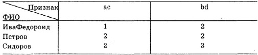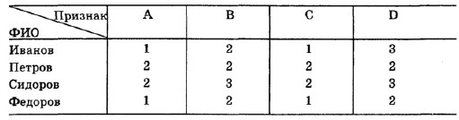 и способы научной классификацииПолученные данные (независимо от канала) могут объединяться (9). Предположим, что мы обследовали некоторую обширную выборку испытуемых (Иванов, Сидоров, Петров, Федоров) по психологическим проявлениям, которые мы можем условно обозначить как А, В, С, D, и свели их в единую таблицу.