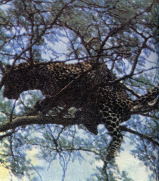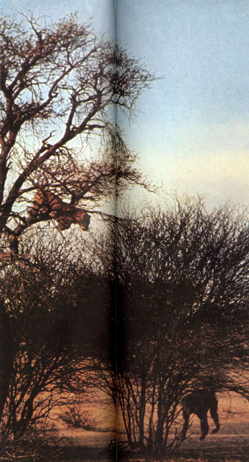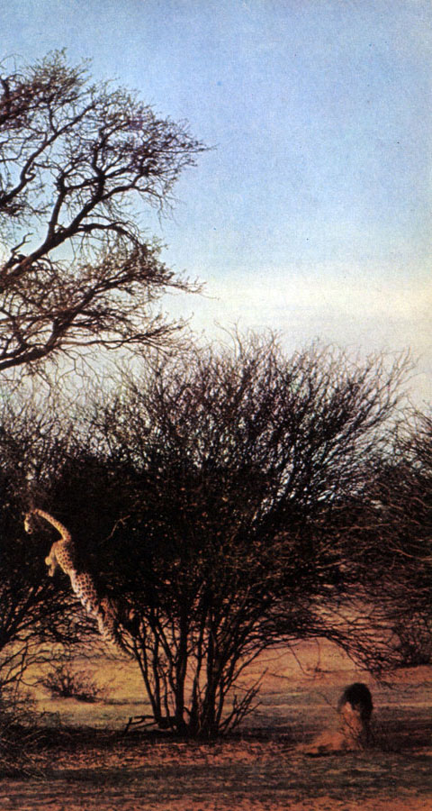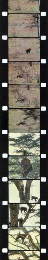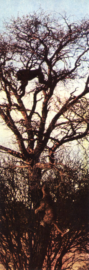 Как известно каждому павиану, спасение - в численном превосходстве. Одинокий павиан - легкая добыча для взрослого леопарда, но три-четыре взрослых самца-павиана способны отогнать леопарда, а то, напав все вместе, и убить его. В киноэпизоде слева павиан вприпрыжку бежит за испуганным леопардом, как и его товарищи за кадром. Леопард мчится к акации, где ему легче защищаться, и влезает по стволу, как раз когда подбегает все стадо. На снимке вверху окруженный орущими павианами леопард примостился на конце ветки.